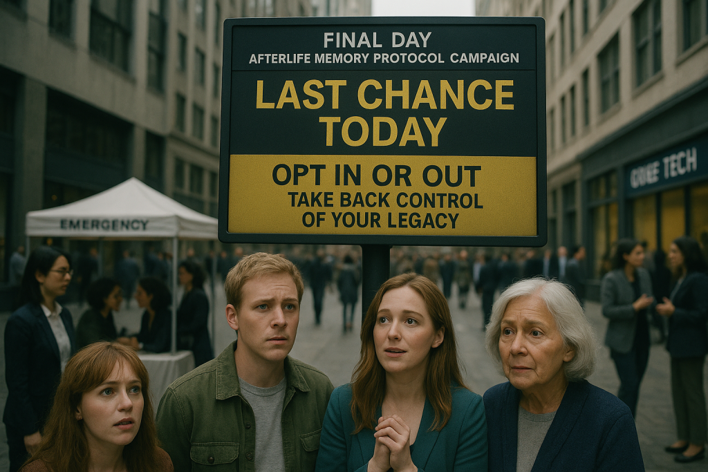 Today marks the final day of the Afterlife Memory Protocol Campaign. Across the city, every smart device displays the same urgent message: